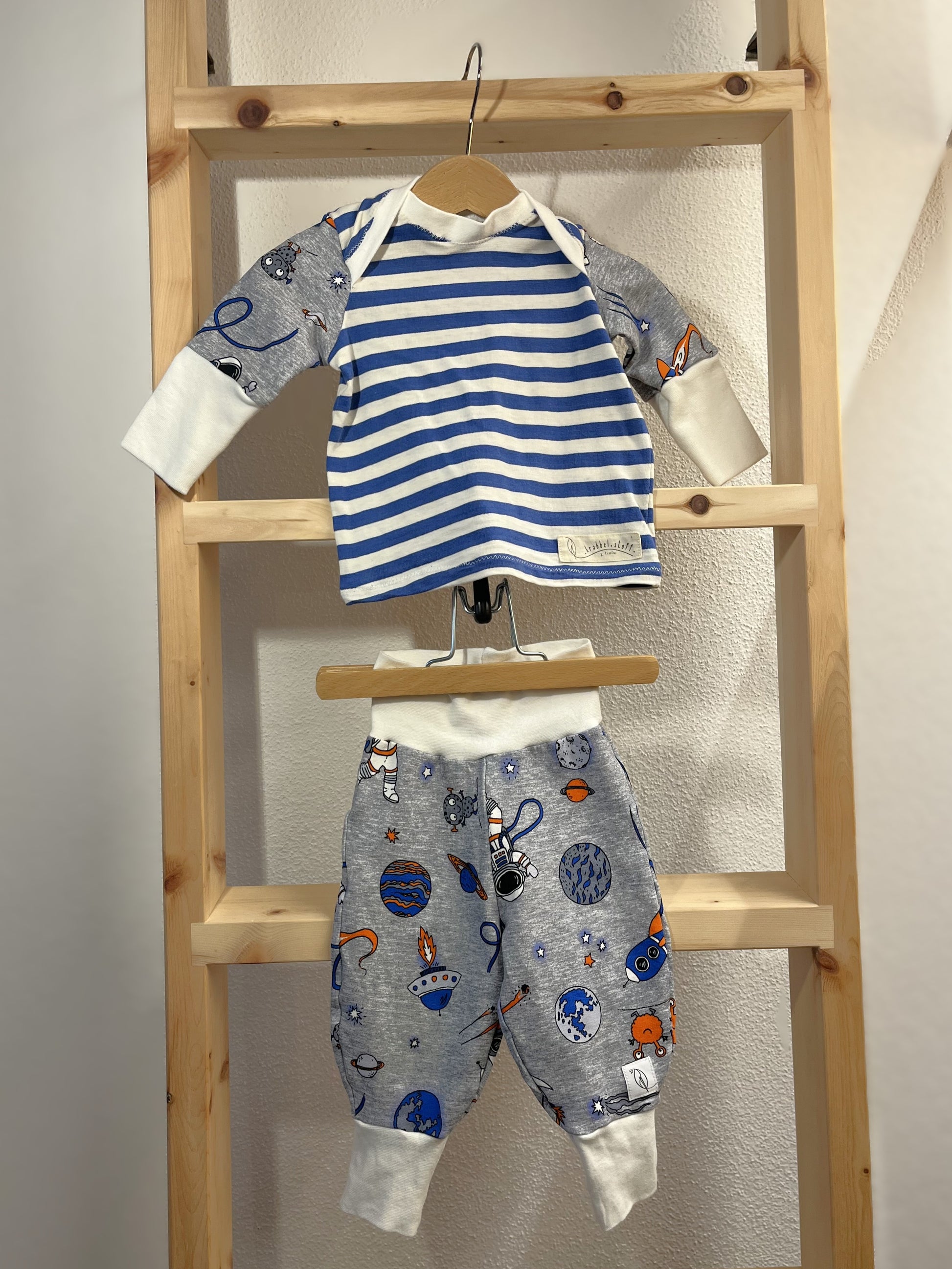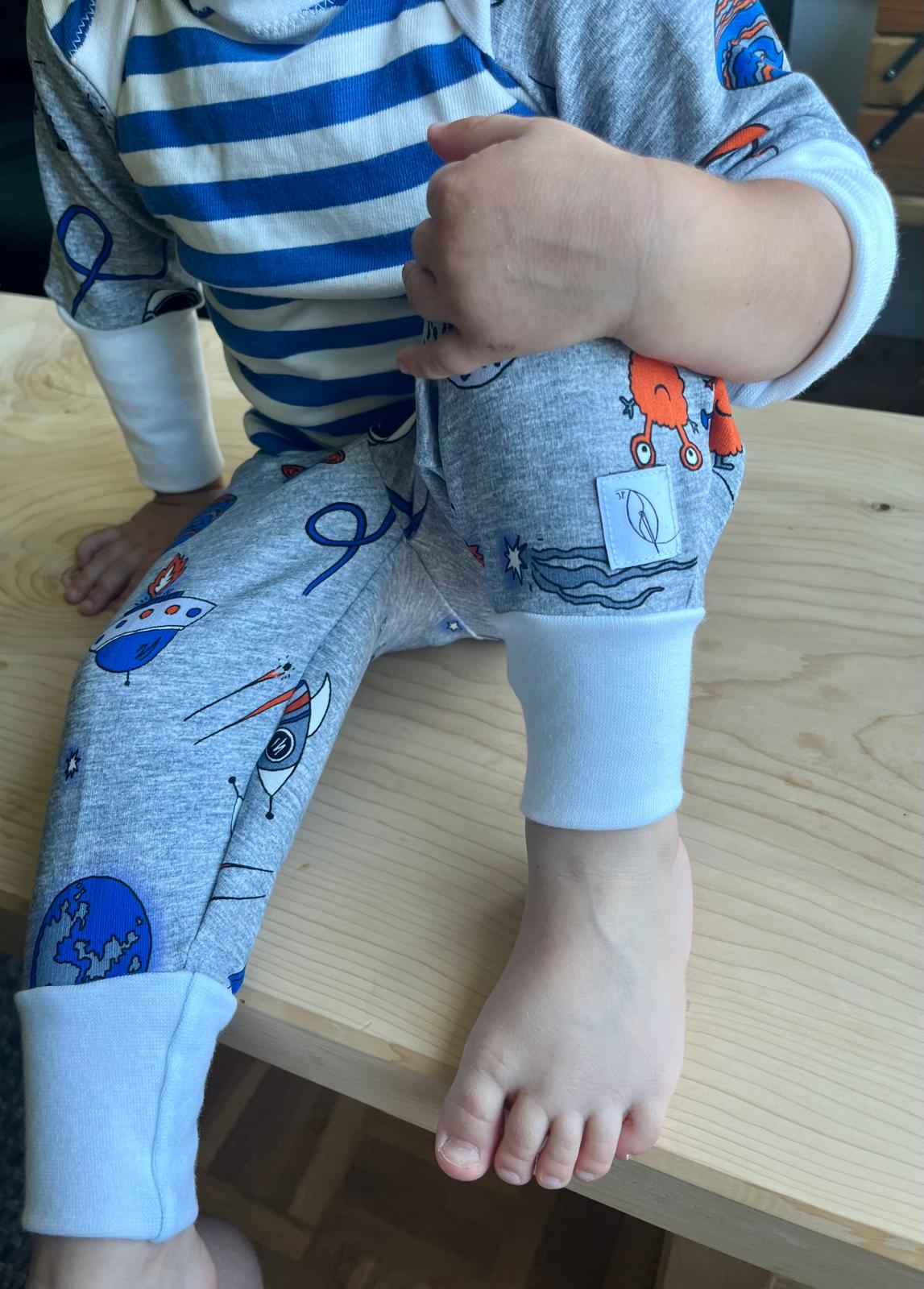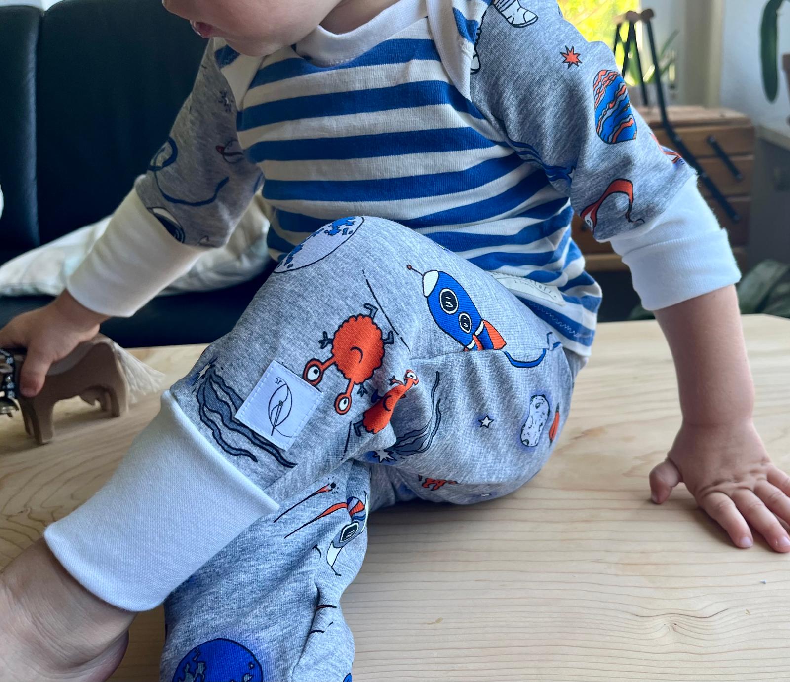 Questo cofanetto regalo preparato con cura, contiene un paio di pantaloni che con la loro elasticità e comodità si adattano perfettamente alle esigenze del tuo bambino e ai pannolini lavabili. i nostri vestiti sono senza cerniere e bottoni, il che li rende particolarmente comodi da indossare e togliere. Grazie ai risvolti le maglie e i pantaloni si adattano alla crescita del bambino e permettono di essere usati piu a lungo.