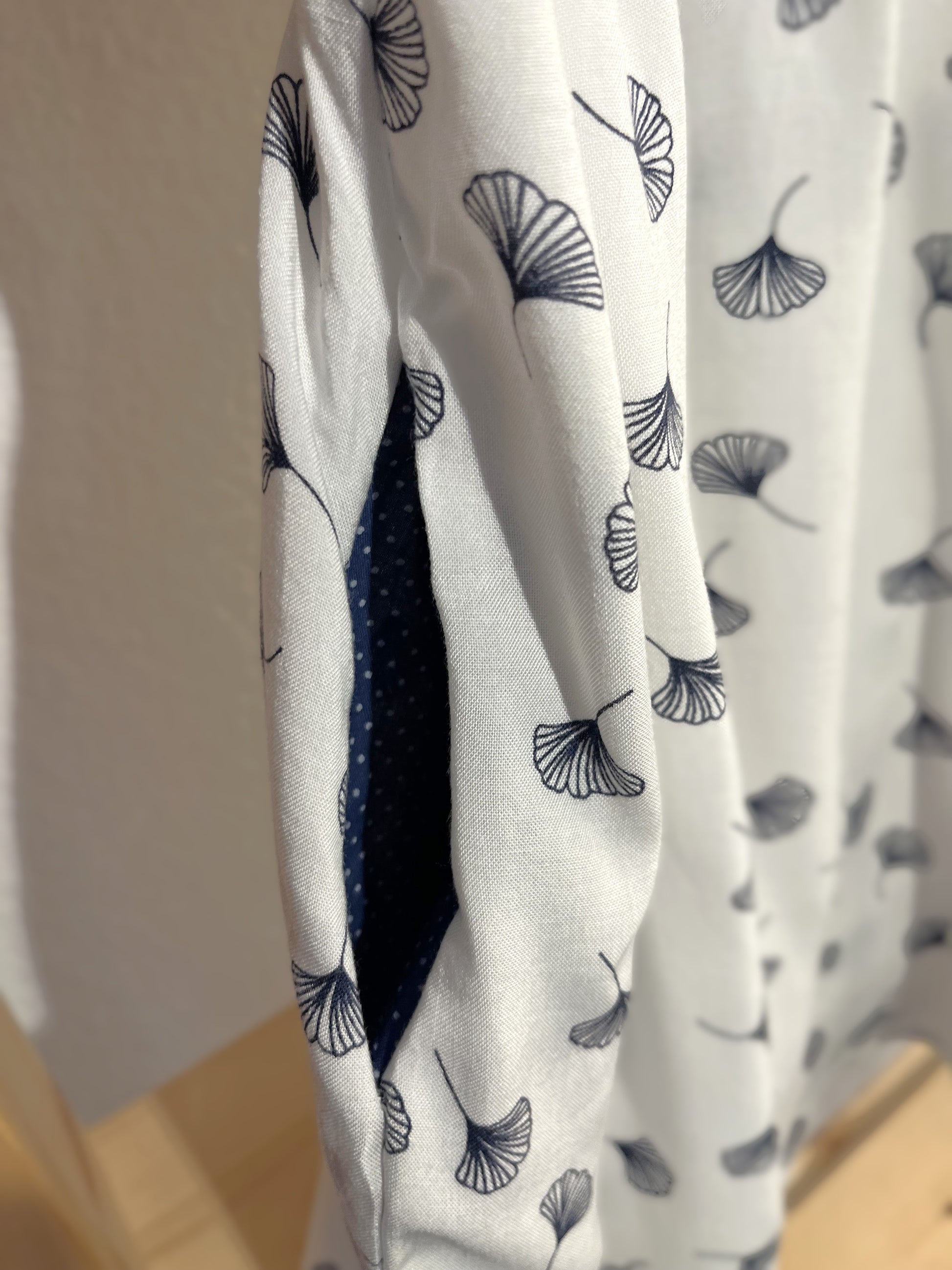 - Vestito Bianco ginkgo:Stoffa Bianca Viscosa riutilizzata, Cotone Blu da stoffa riutilizzata.