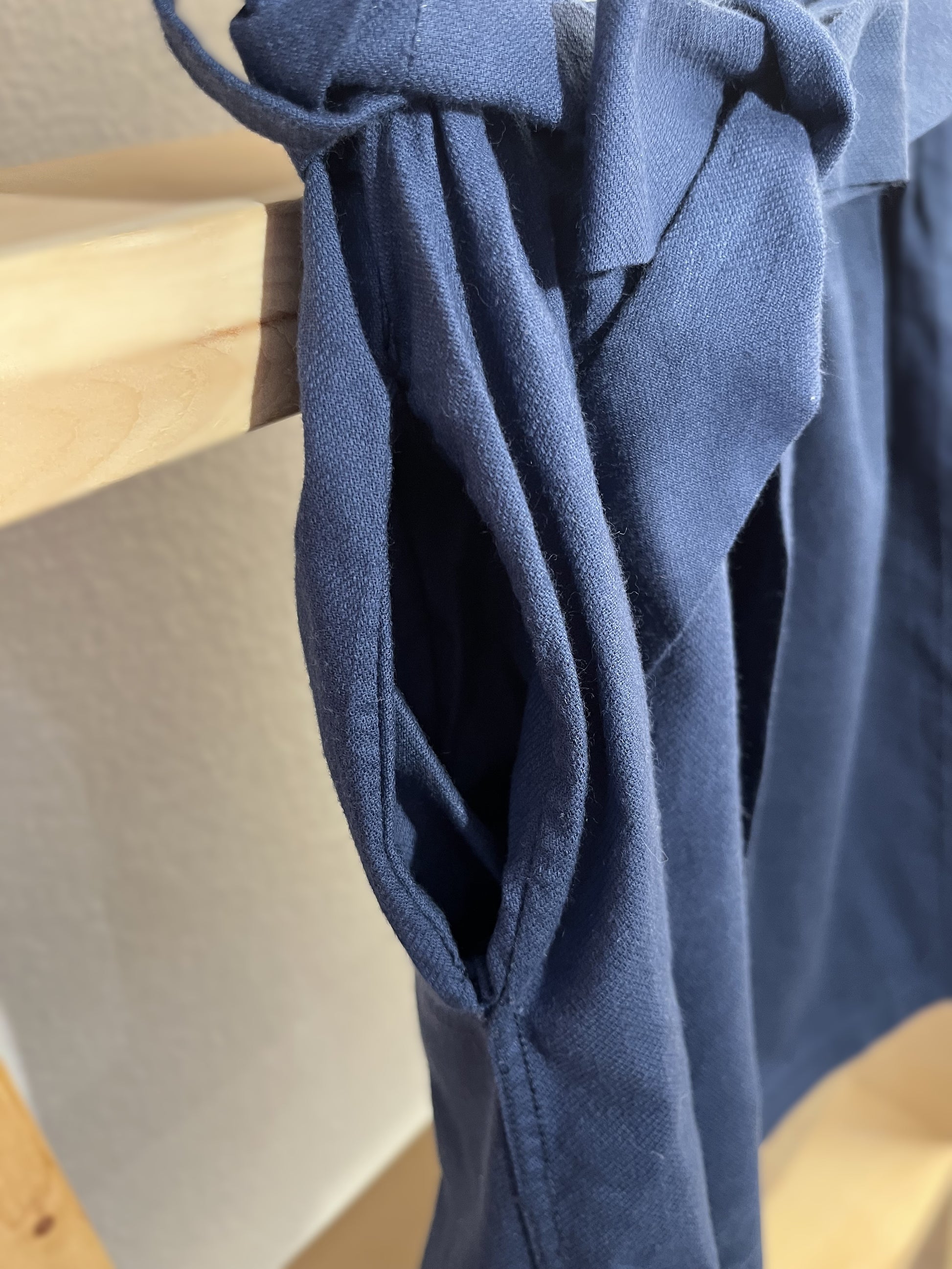 Questo vestito realizzato a mano comodo da indossare. Ha delle pratiche tasche e una cintura. Chiuso sulla schiena tramite un bottone.