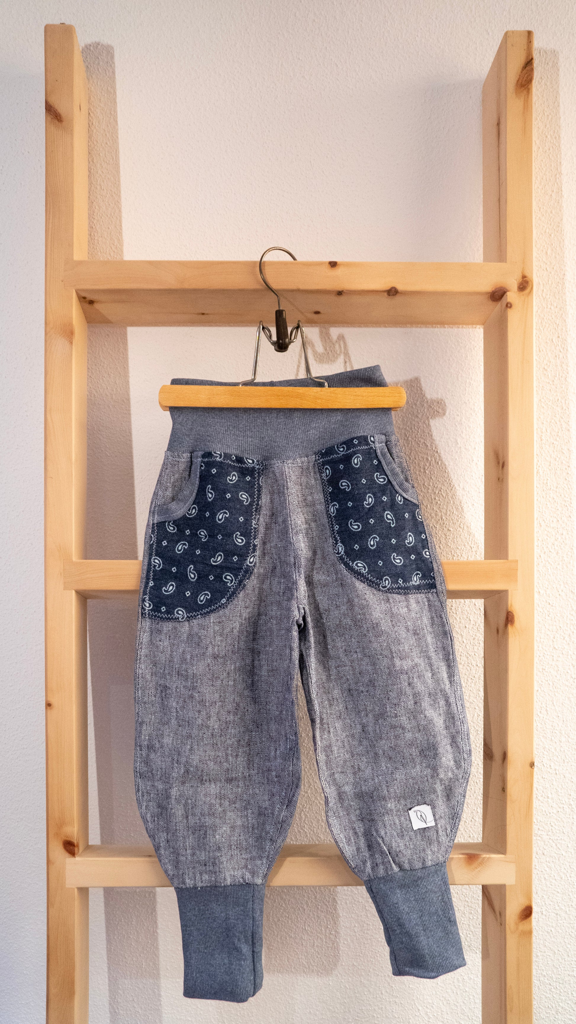 - Pantaloni Blu fantasia: pantaloni e risvolti realizzati con tessuto nuovo, tasche e rinforzi in tessuto usato. jersey cotone
