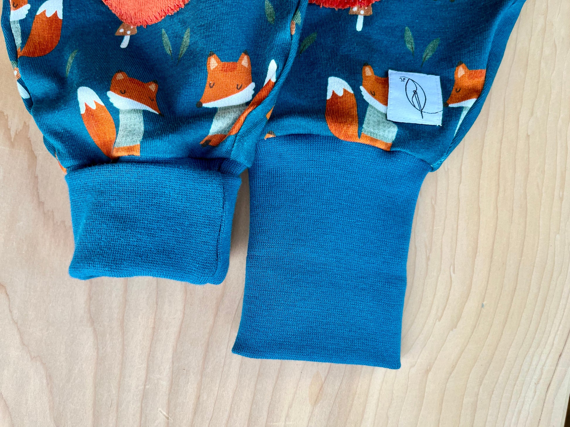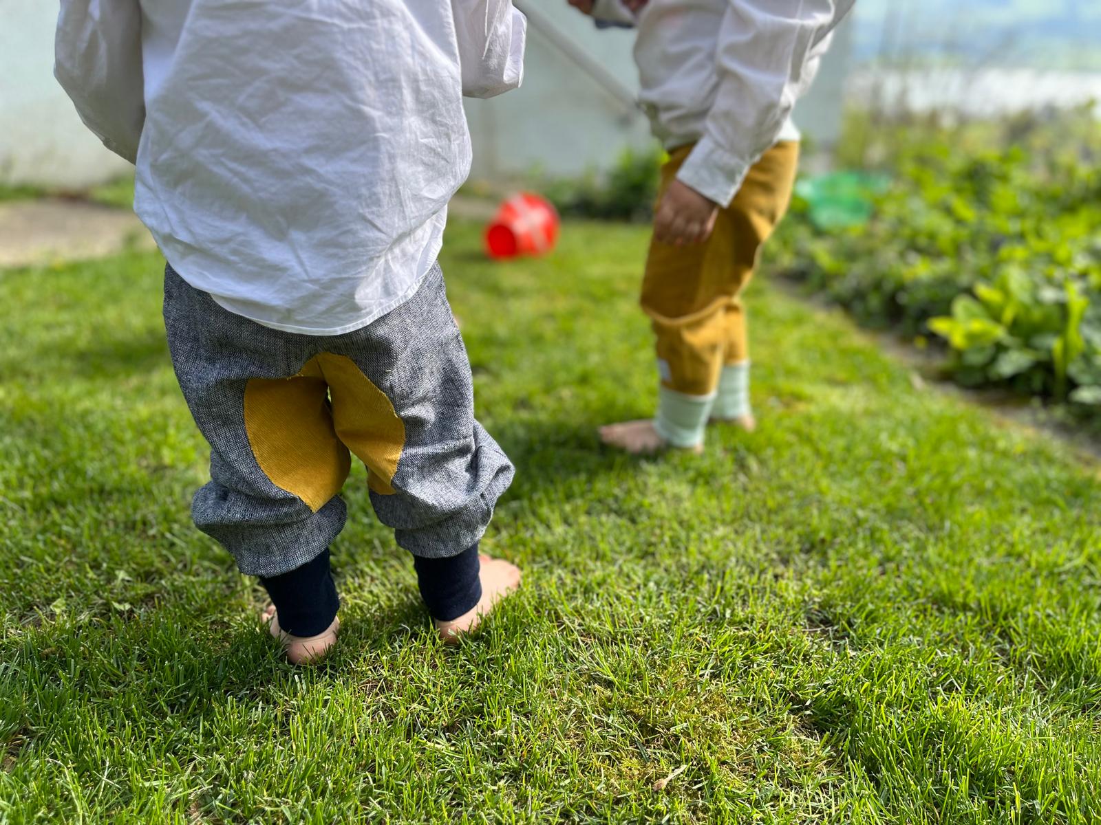 Questi pantaloni cuciti a mano sono elastici e comodi. I risvolti su pancia e gambe sono pieghevoli e crescono con il tuo bambino. I pantaloni sono ideali per i pannolini lavabili perché sono molto elastici e spaziosi.
