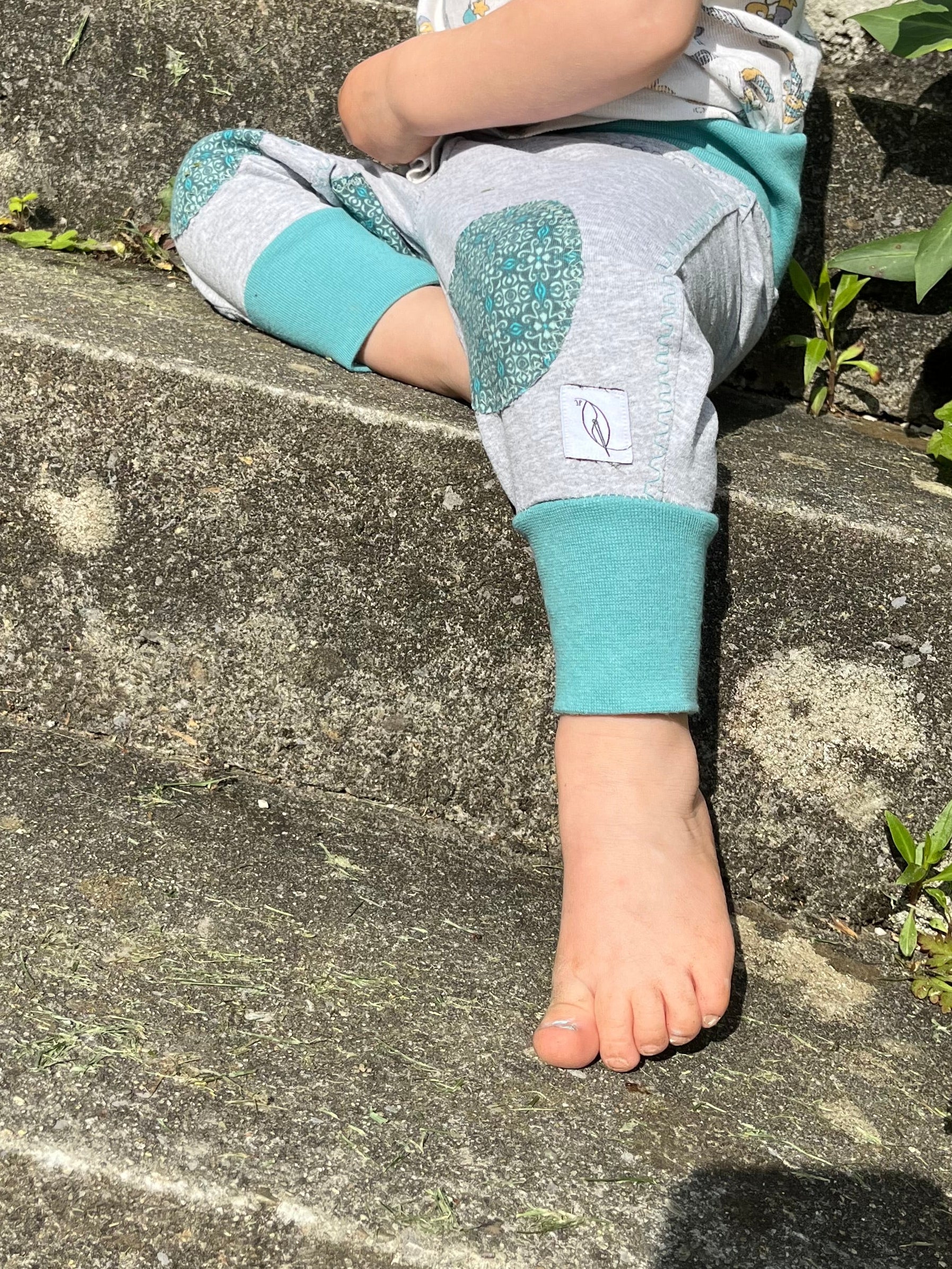 Questi pantaloni cuciti a mano sono elastici e comodi. I risvolti su pancia e gambe sono pieghevoli e crescono con il tuo bambino. I pantaloni sono ideali per i pannolini lavabili perché sono molto elastici e spaziosi.