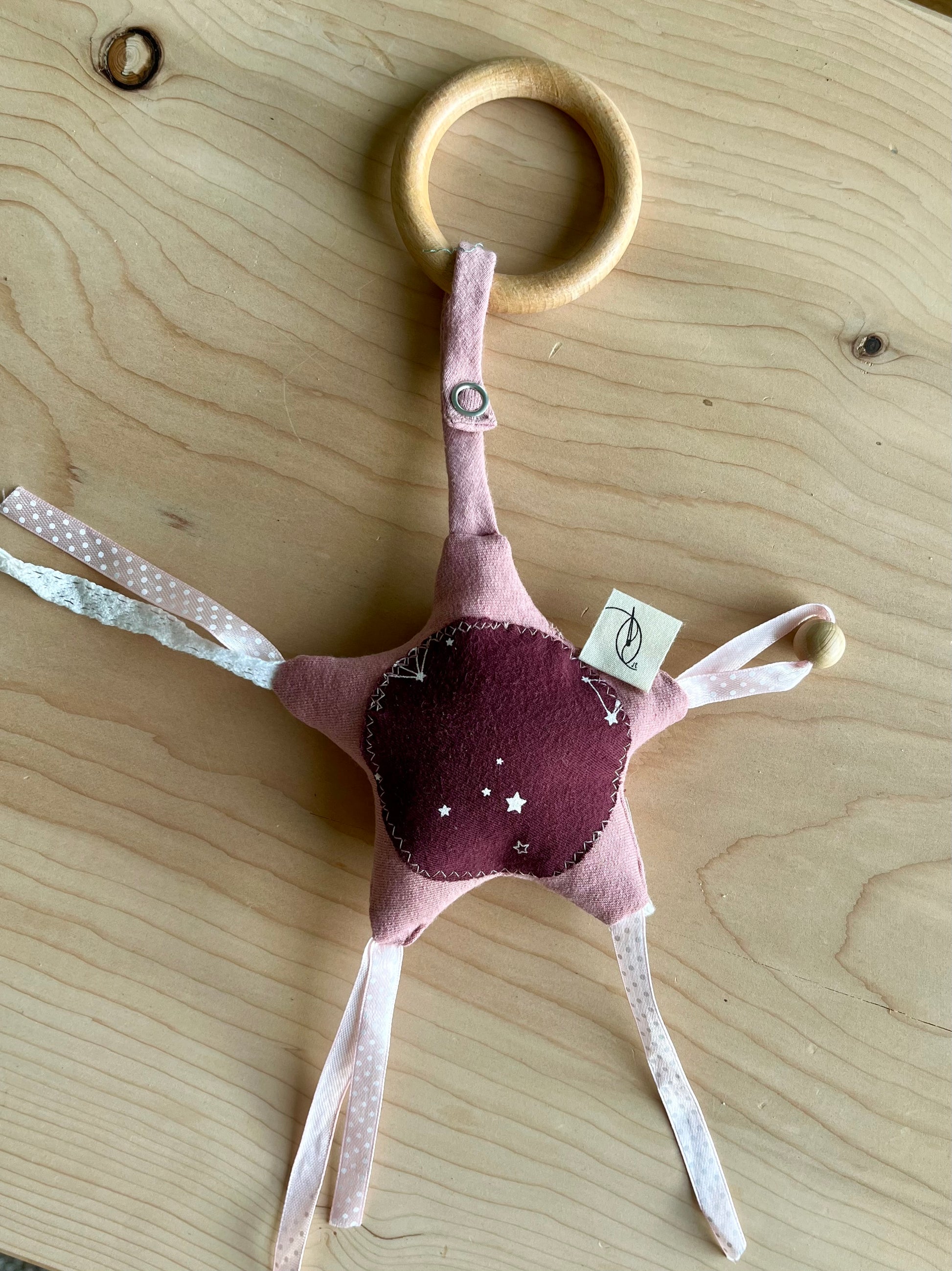 Questo simpatico gioco di pezza, realizzato a mano con ritagli di stoffa e materiale riciclato. Oggetto decorativi per camerette, culle o passeggini.Ha un Cerchio di legno per dentizione(rimuovibile per lavaggio), una perla di leno che puo essere mossa e diversi nastrini. un gioco semplice e stimolante a livello visivo e sensoriale