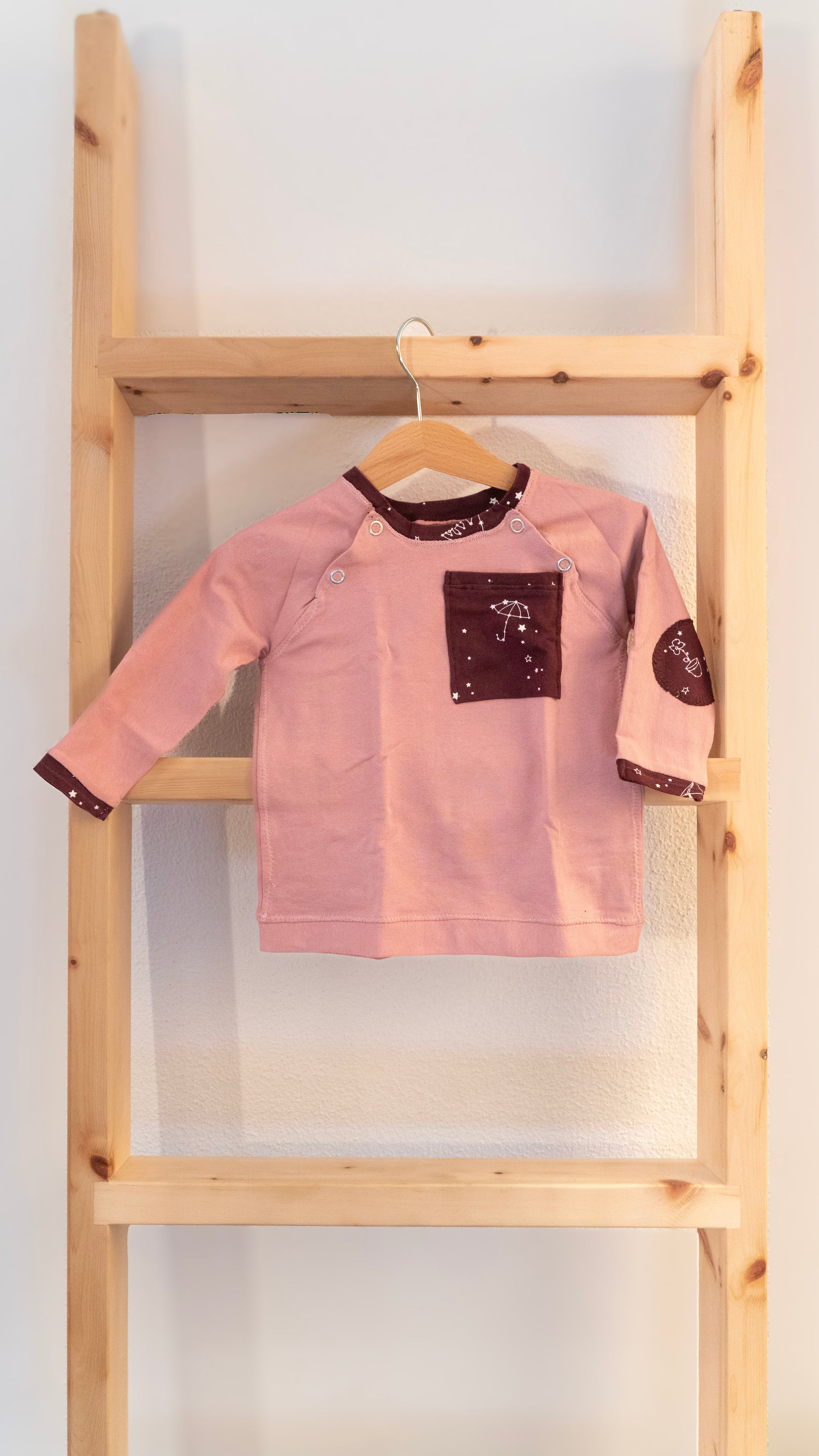 - Oberteil Rosa/Bordeux: Oberteil aus neuem Stoff und Bündchen aus gebrauchtem Stoff.
