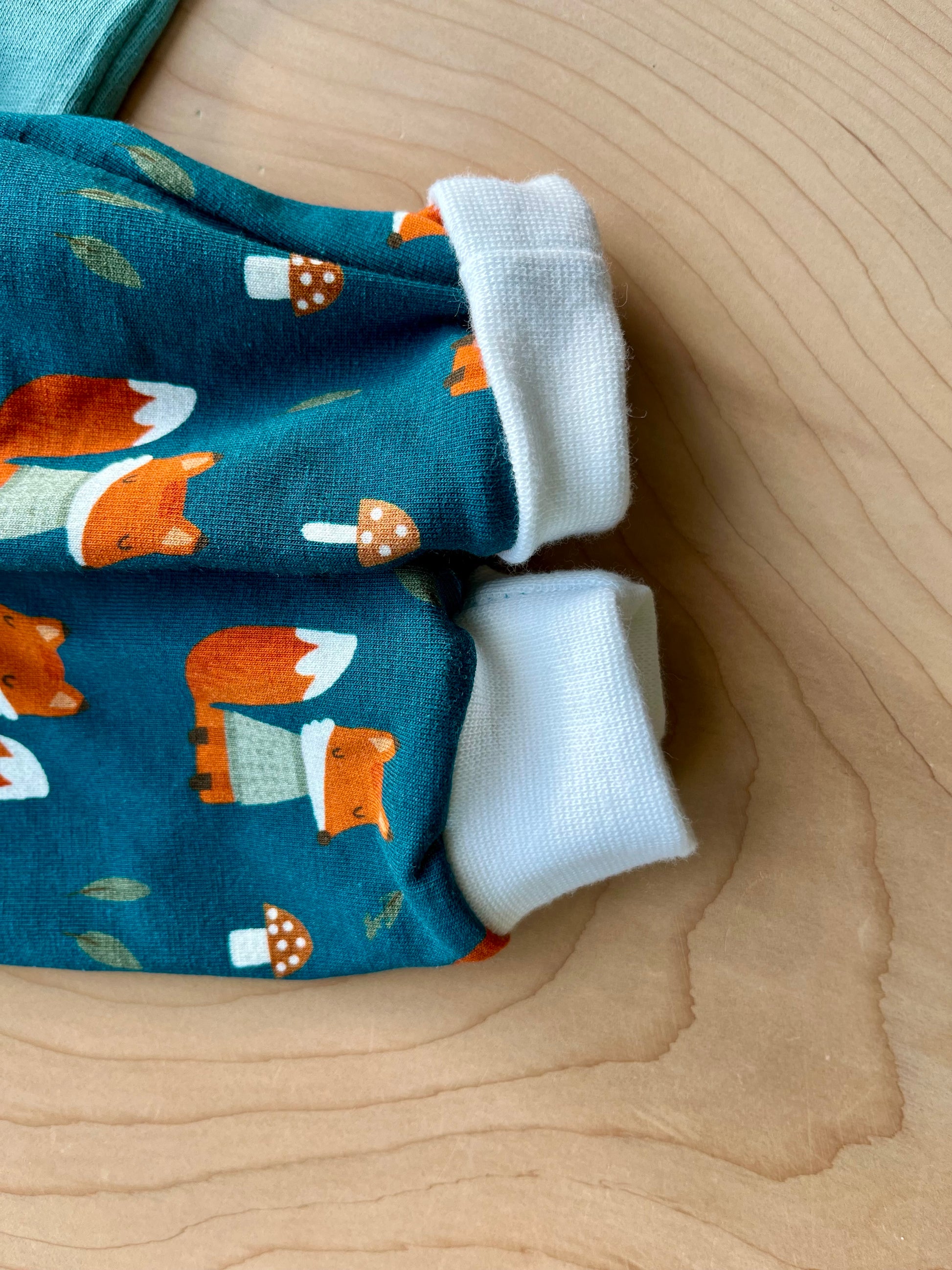 - Hellblau/Fuchs: Oberteil, Ärmel und Bundchen aus neuem Stoff.