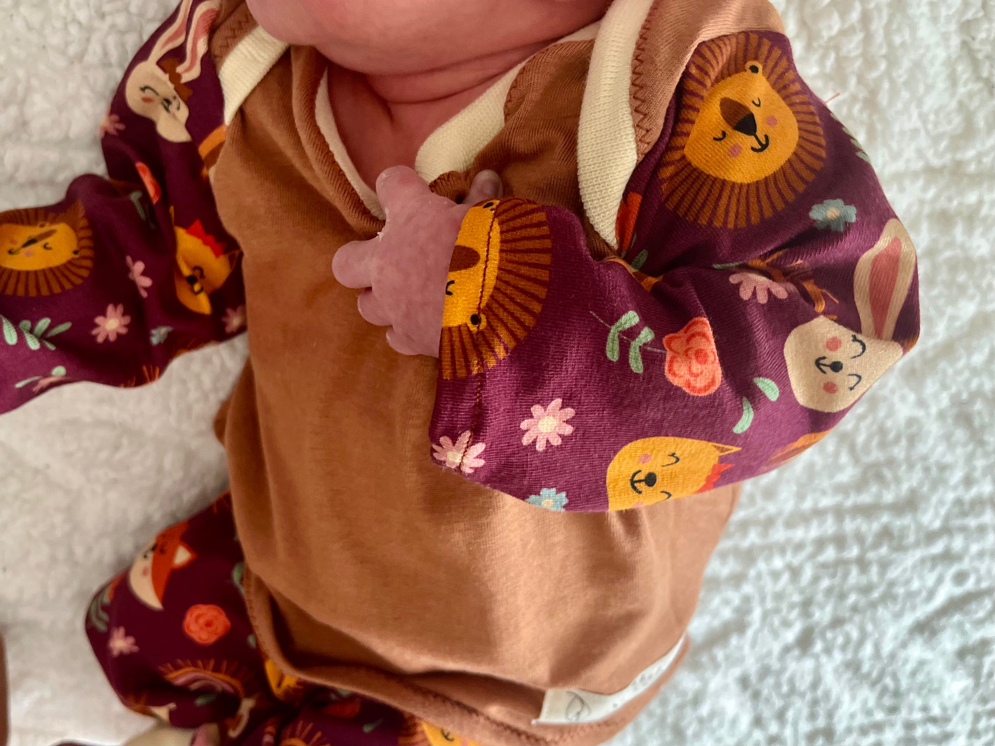 - Oberteil Weiss-gemustert: Oberteil und Bündchen aus neuem Stoff, Ärmel aus gebrauchtem Stoff.