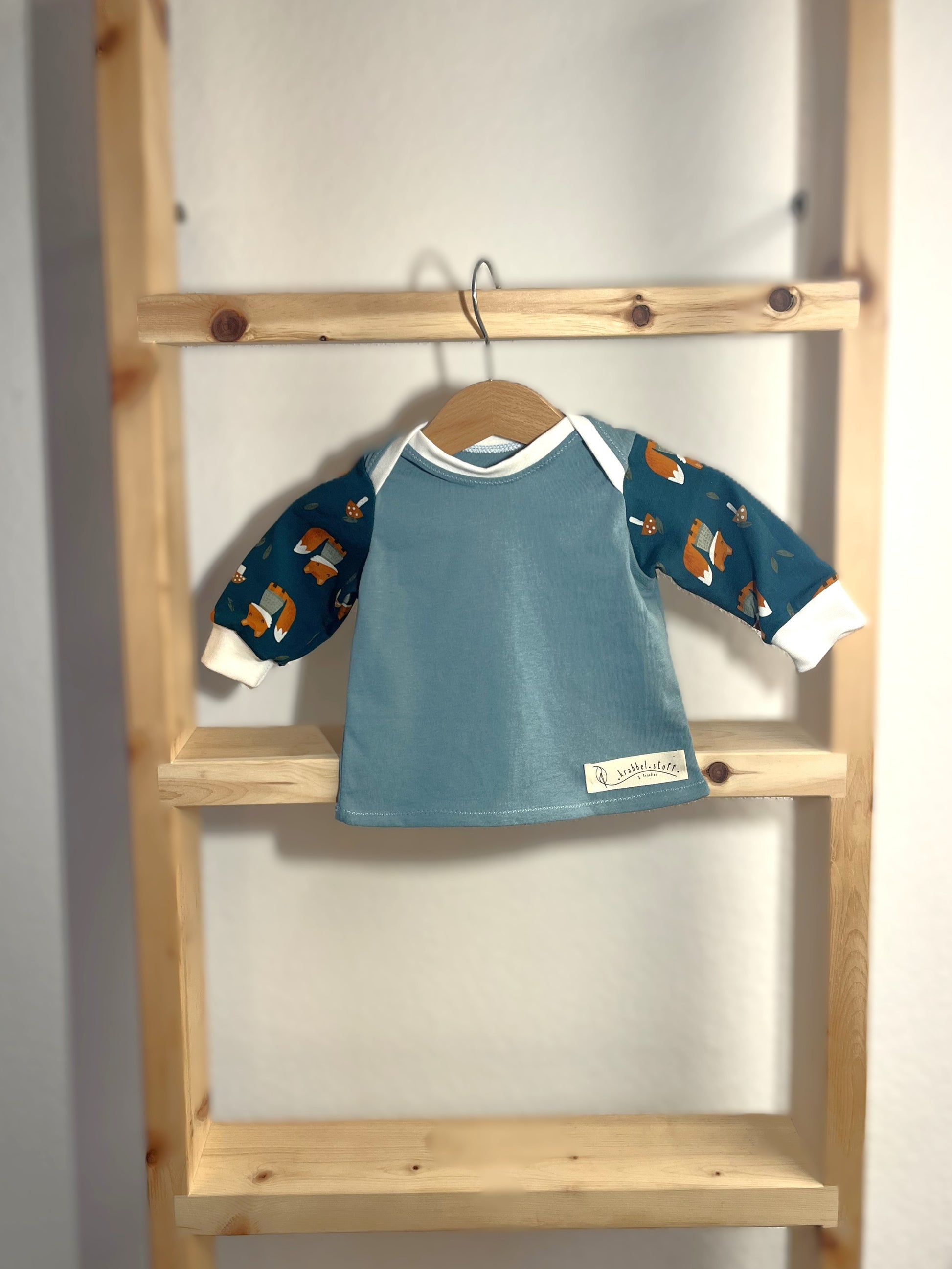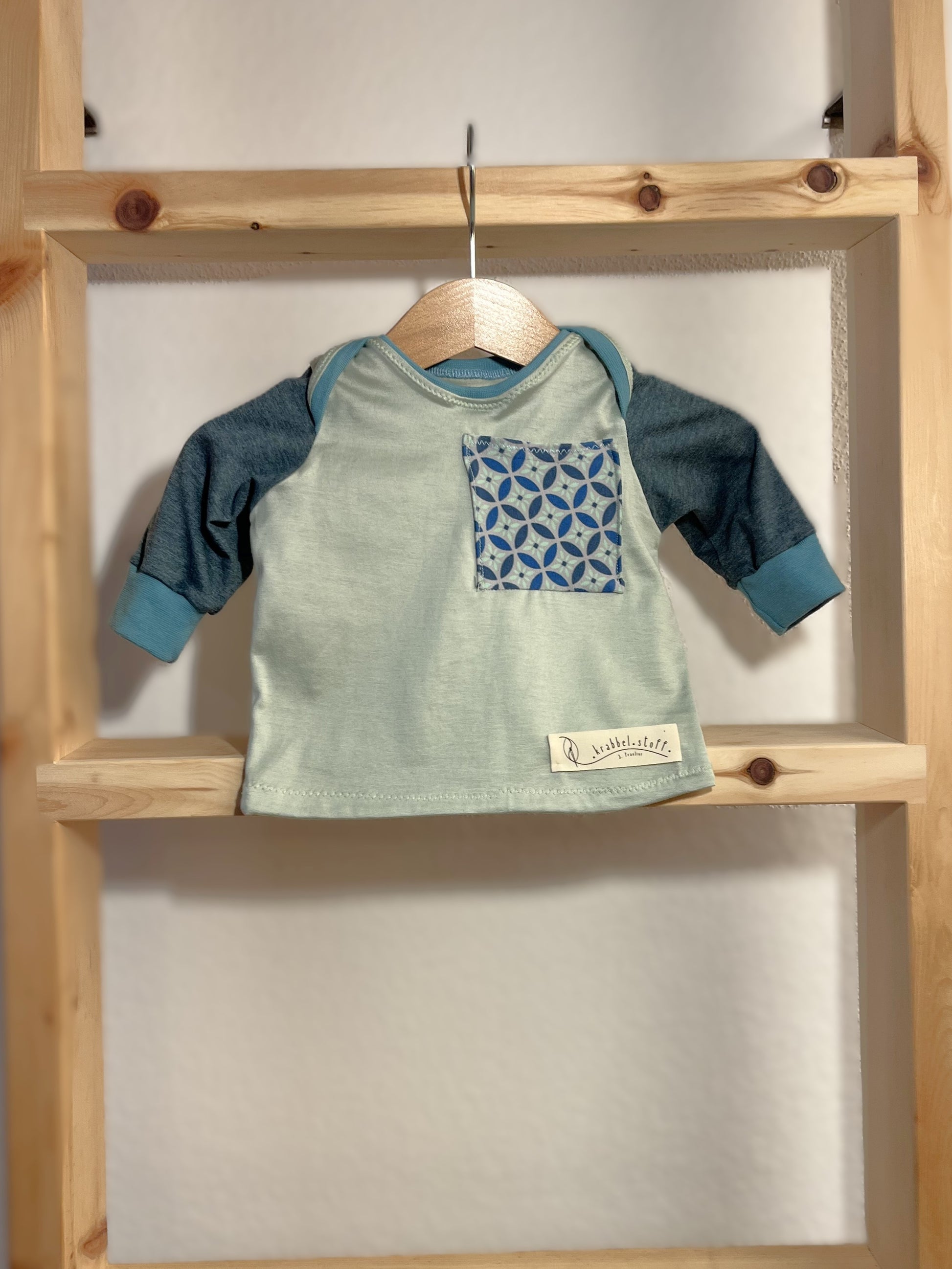 - Wasserblau/gemustert: Oberteil und Bündchen aus neuem Stoff, Ärmel aus gebrauchtem Stoff.