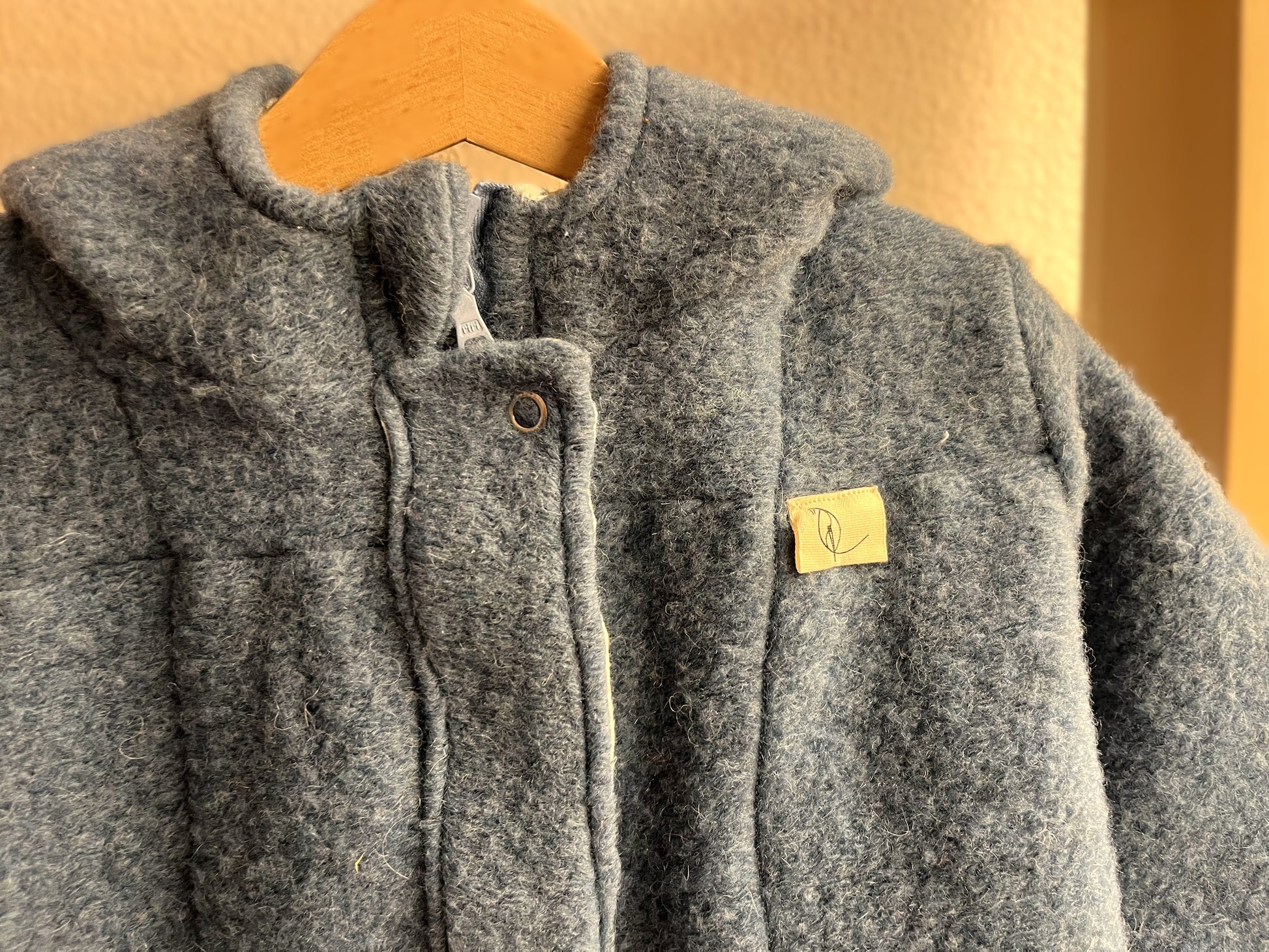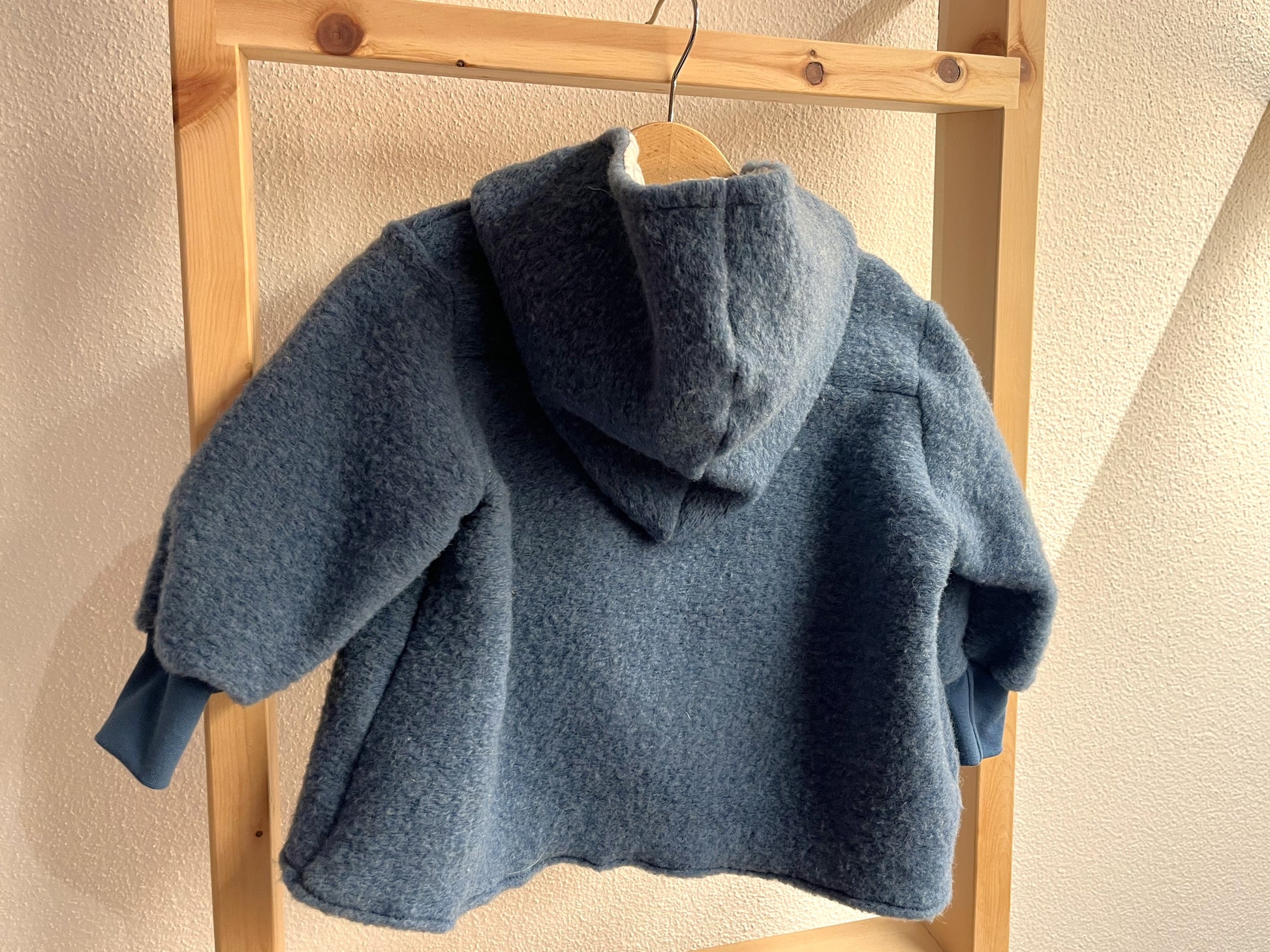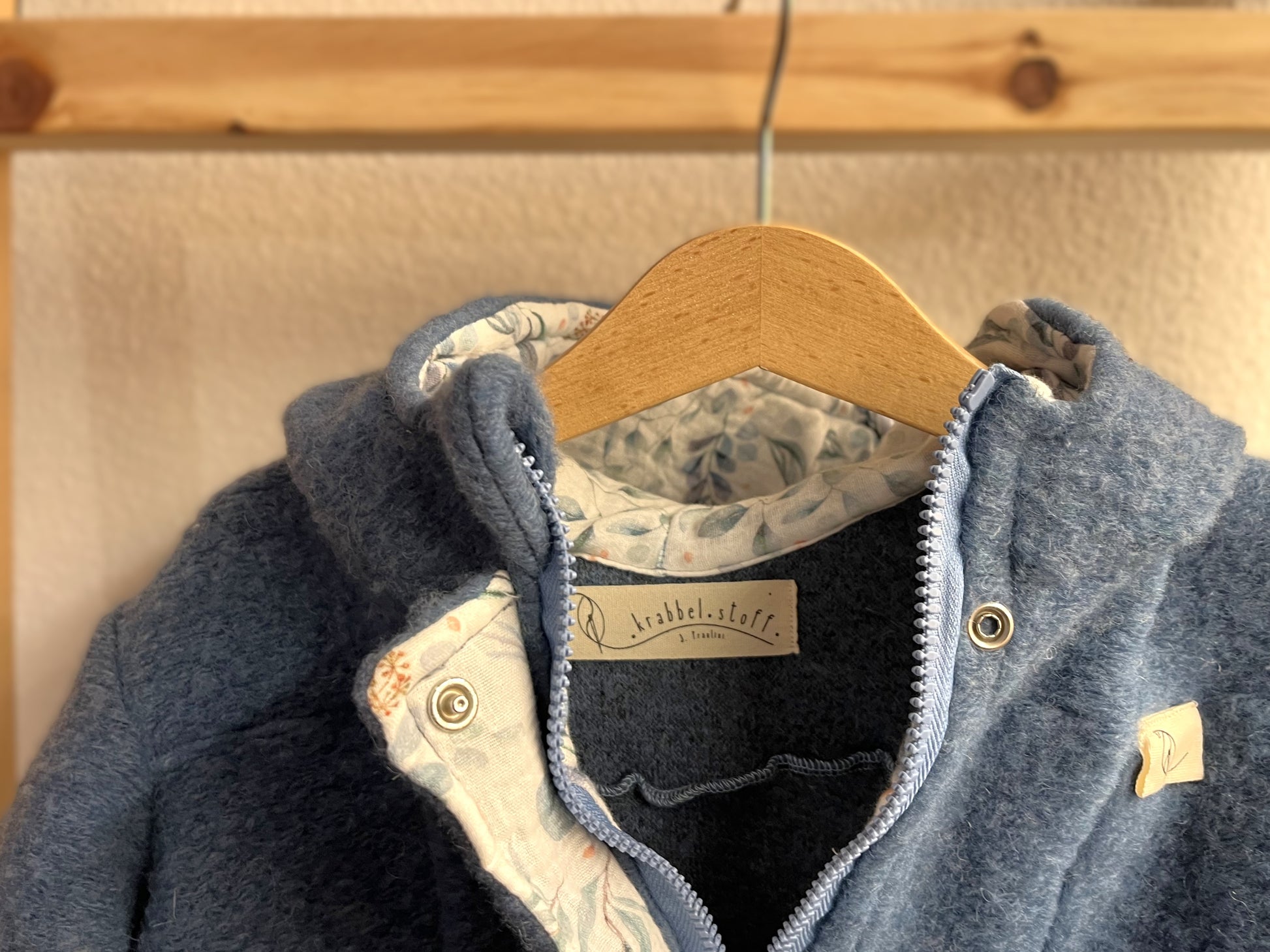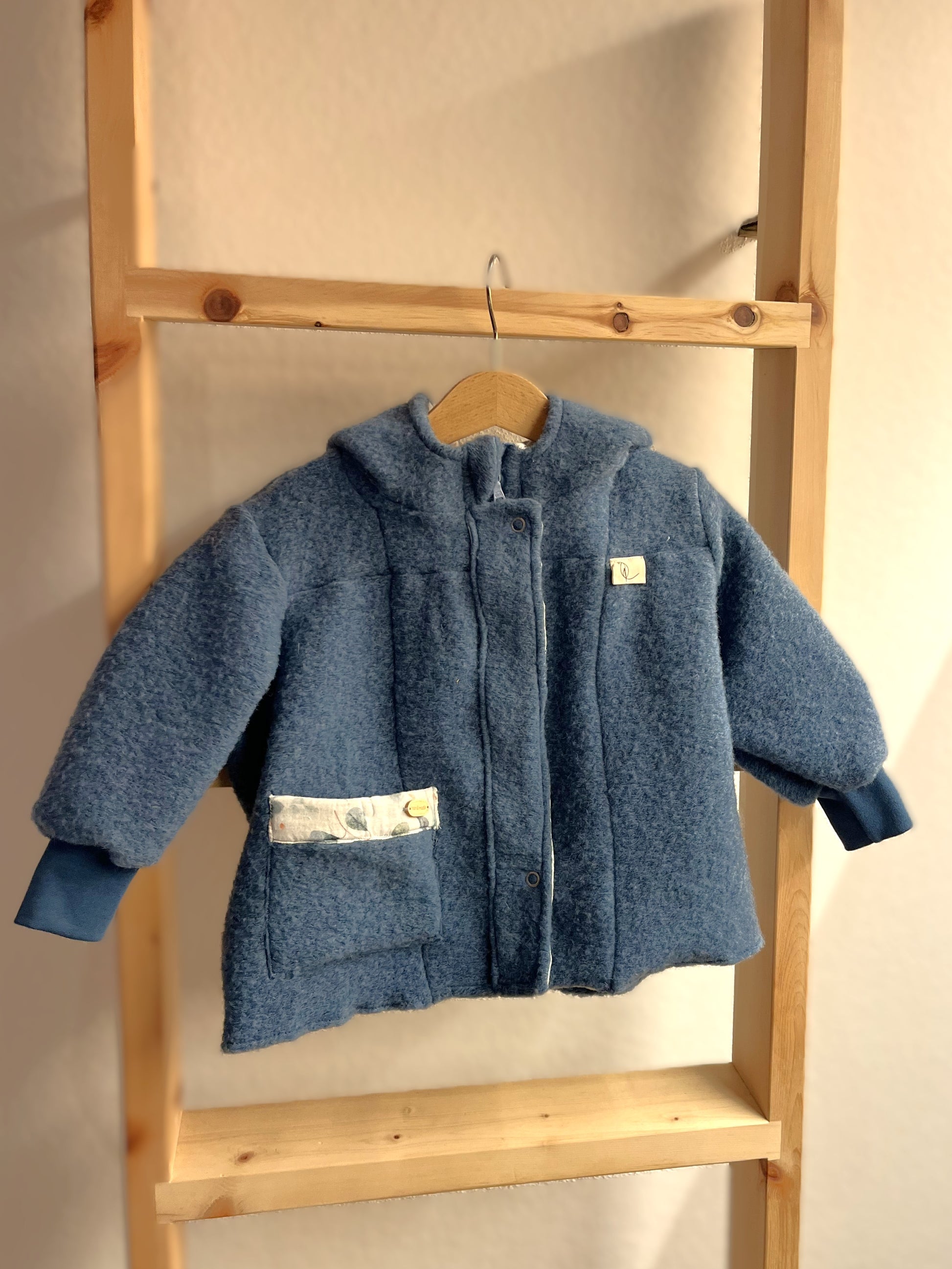 Handgefertigte blaue Merino- Jacke mit 1 Tasche, Druckknöpfen, reissverscluss und umklappbaren Ärmelbündchen. Perfekt für den Alltag von Kindern im Alter von 2-3 Jahren. Mit Kapuze, Taschen und Musselin-Details. Atmungsaktiv, gemütlich, Weich, luftig und unkompliziert - der ideale Begleiter für jeden Tag.